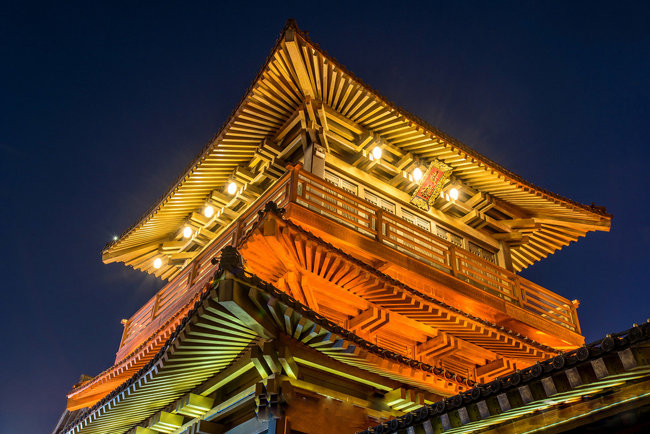 中国传统建筑很明显的一个建筑特征表现为大屋顶,但经过曲面、曲线的处理和装饰,不会显得笨拙。由于中国传统建筑这种特别的屋顶形式,所以对屋顶的夜间照明更要进行重点的处理,这样便可将古建筑的神韵表现出来。而其屋顶的形式,材料及斗拱上鲜艳的彩画装饰,都会对照明产生很大的影响。若屋面由瓦铺装,可在檐口处设置小型的投光灯向上投光,或顺着屋脊处设置小型投光灯向下投光,不仅展现出传统屋顶的结构美感,而且体现出屋面起翘的轮廓。也可以使用勾勒屋顶的方式,将屋顶所特有的形态精髓描绘出来。同样,屋顶的屋脊和其他一些细部,也可以使用小巧的光纤灯具进行局部的表现。