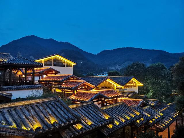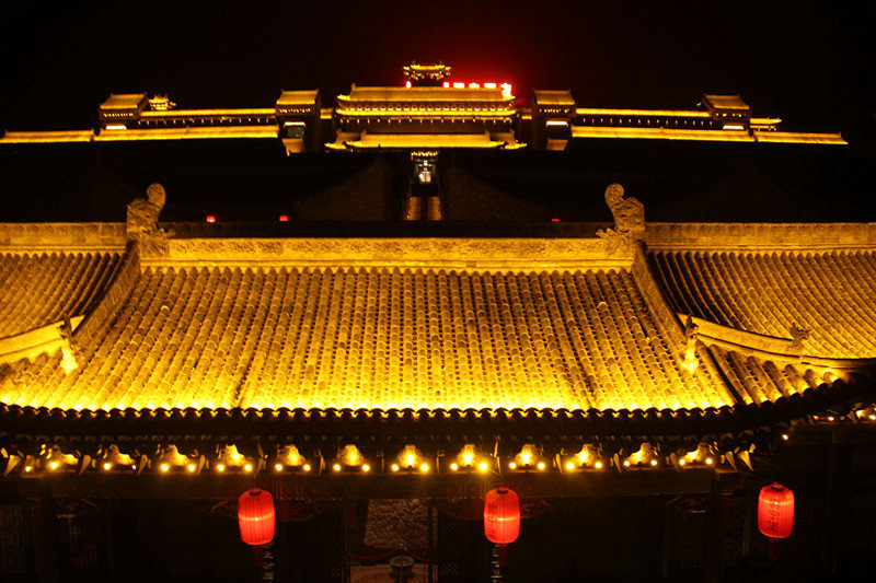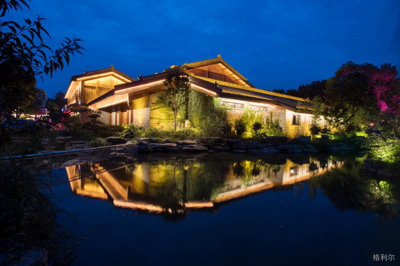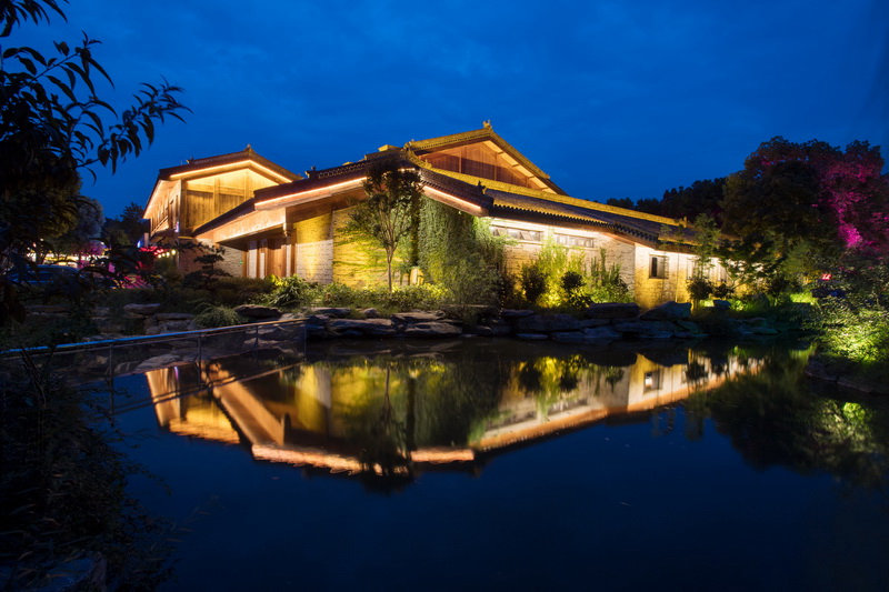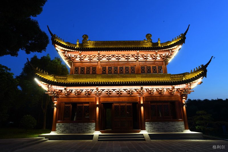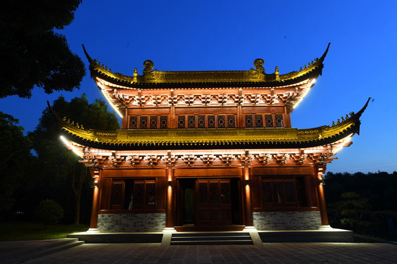 打亮坡屋面,同时照亮屋身的柱或墙,也是表达中国传统建筑照明的一种方式。但采用相结合的照明,容易出现各部分均等照明或建筑所有部分都很亮的情况,因此,要注重建筑照明的明暗关系。根据建筑的明、次、稍等开间的柱位布置灯光,突出开间柱身韵律及檐下斗拱的丰富关系。明间部位可采取灯光加强措施使上部的牌匾更引人注目。在建筑的外部也可以设置投光灯,灯具藏在周围环境的绿化中,甚至可以与绿化照明相结合。